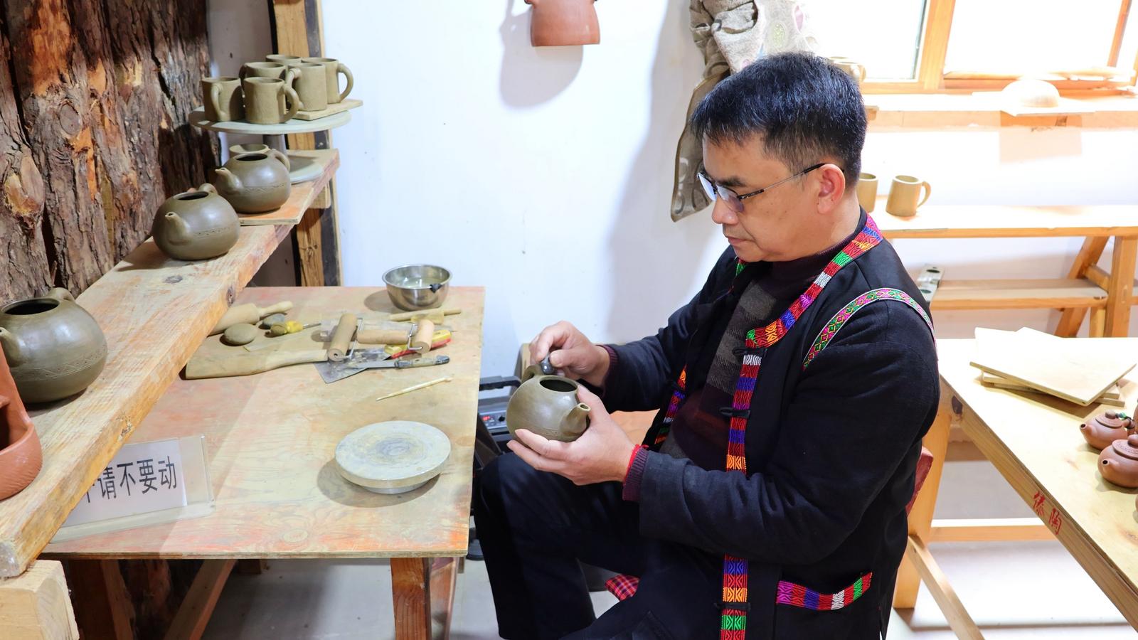 工作架上,既有古朴的水罐陶锅,也有融合民族元素的香炉、茶具。每道纹路,都让日常器物多了一层文化的温度。