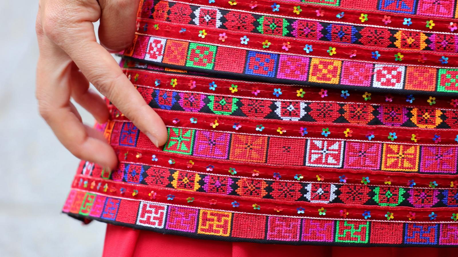 白金林介绍:“像我们传统的服饰,完整做下来可能要4个月或半年以上,纯手工制作,刺绣会比较繁琐。我们衣服上的刺绣图案,主要是根据我们身边的花草树木、动植物之类的元素来取材,就像我裙子上这个,米字和八角,就有五谷丰登的含义。”